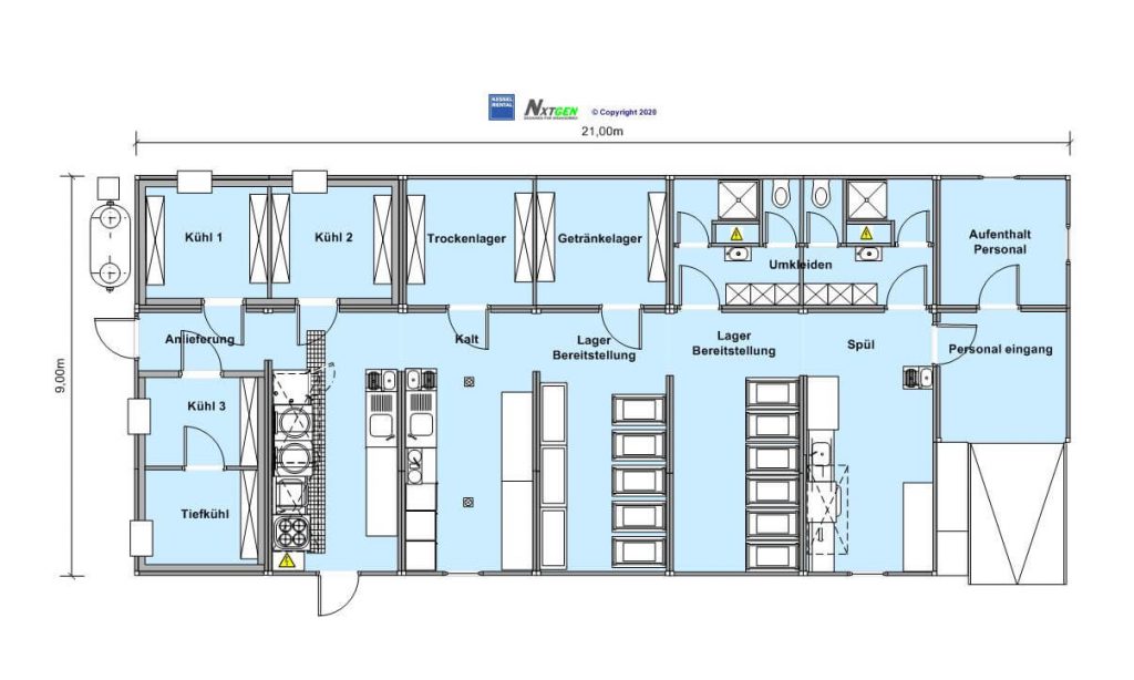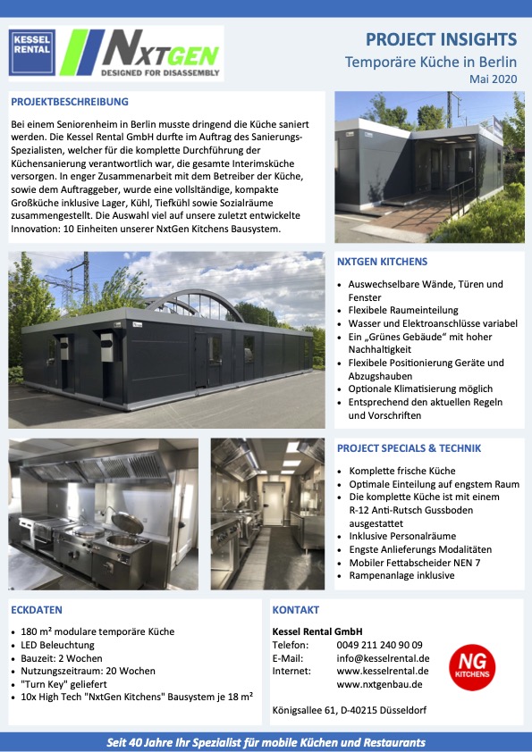 Die NxtGen Modulares Bauen GmbH durfte im Auftrag des Sanierungs-Spezialisten, welcher für die komplette Durchführung der Küchensanierung verantwortlich war, die komplette Interimsküche versorgen. In enge Zusammenarbeit mit dem Betreiber der Küche, sowie dem Auftraggeber, wurde eine komplette, kompakte Großküche inklusive Lager, Kühl, Tief-Kühl und Sozialräume zusammengestellt. Hierfür ausgewählt wurde unsere zuletzt entwickelte Innovation: NxtGen Small Küchencontainer.