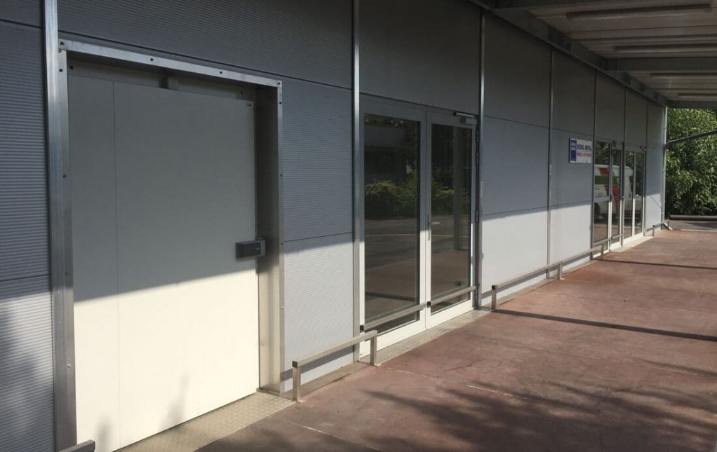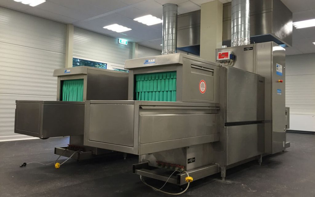 Ein Modulares Gebäude von 15x20m, ausgestattet mit einer Transportwagenwäsche, Nassmüllkühlzelle und zwei großen Bandspülmaschinen. Um die Logistik von An- und Auslieferung der großen Menge Geschirr zu gewährleisten, wurde das Gebäude mit einer Überdachung von 20×2,50m, über die komplette Länge des modularen Gebäudes, ausgestattet.