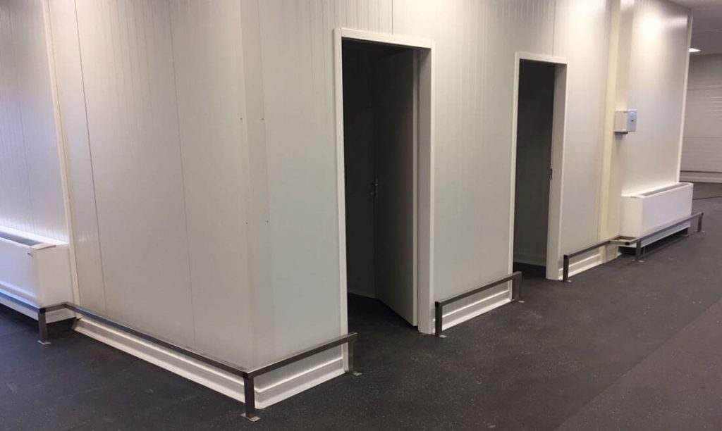 Des Weiteren wurde die Interimsanlage mit einem R-12 Anti Rutsch Bodenbelag, Systemdecke (Raumhöhe 3m) mit integrierter Beleuchtung, isolierte Abwasserleitungen und Wasserenthärtungsanlage ausgestattet. Auf Kundenwünsch wurde die komplette Anlage klimatisiert.